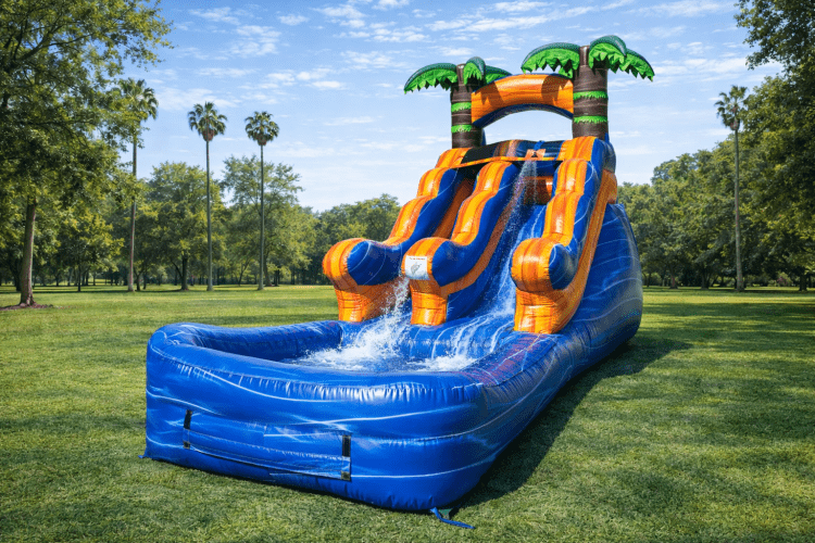 Mini Tropical Water Slide — a compact, vibrant wet slide that brings a splash of island fun to smaller yards and events. Standing about 13 feet tall with a 19-foot length and a 9-foot width, this inflatable features two side-by-side sliding lanes framed by bright tropical colors and palm tree arches. Riders climb a short, safe interior ladder, launch down smooth, water-lubricated lanes and land in a shallow splash pool that’s easy for attendants to monitor. Designed for backyard parties, small gatherings, or community events where space is limited, it delivers the excitement of a full-size water slide while fitting into tighter footprints and simpler setups.